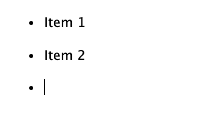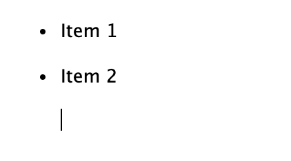 While this covers many simple list editing tasks, there is a variety of other actions you may want to take within lists, including creating nested lists and adding paragraphs or code blocks to an exiting list item. From an empty list item (pictured at left), the following keyboard gestures can be used to do this: